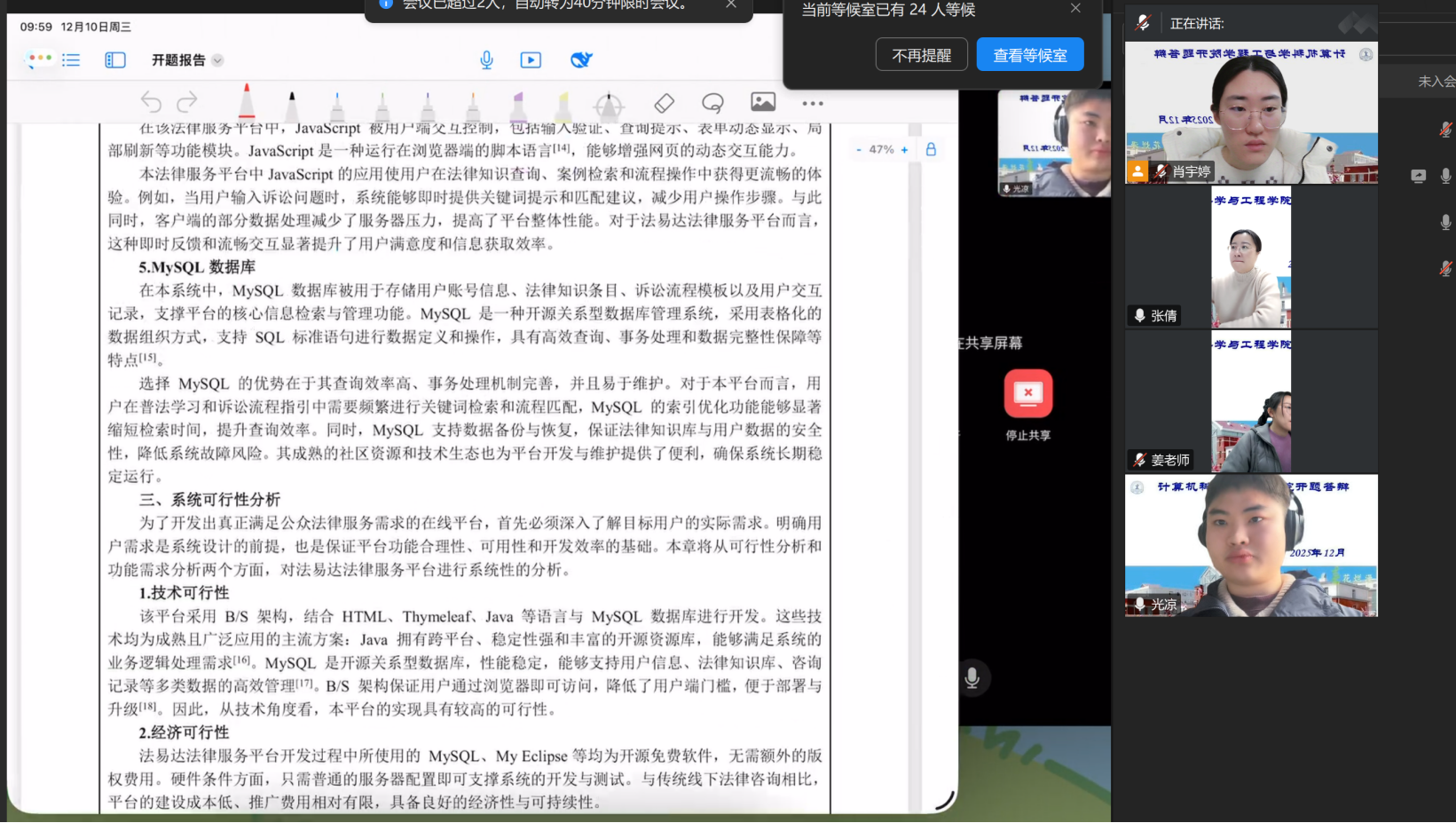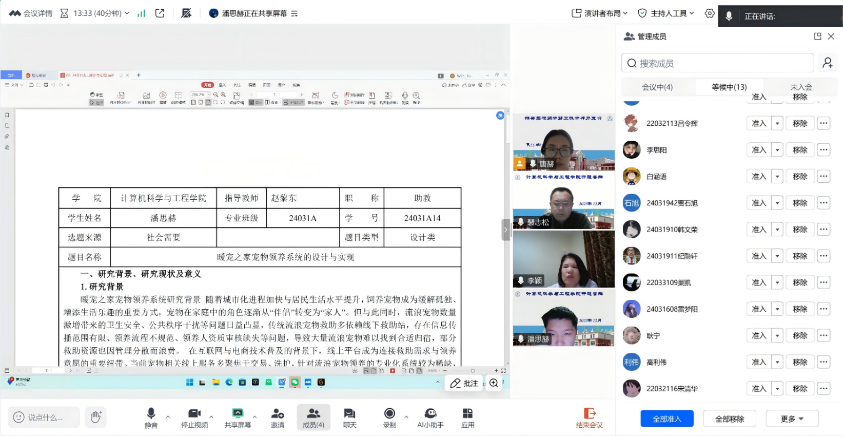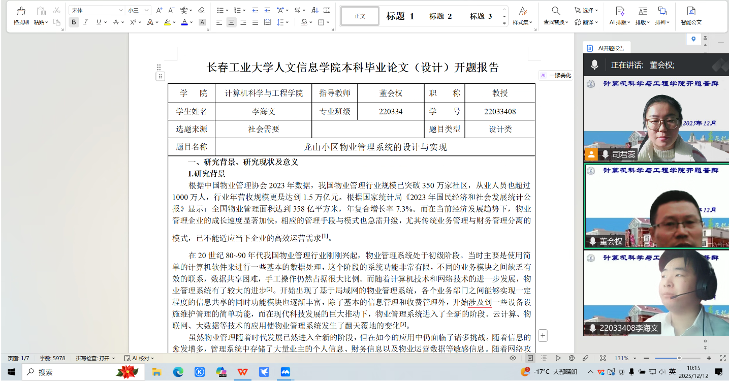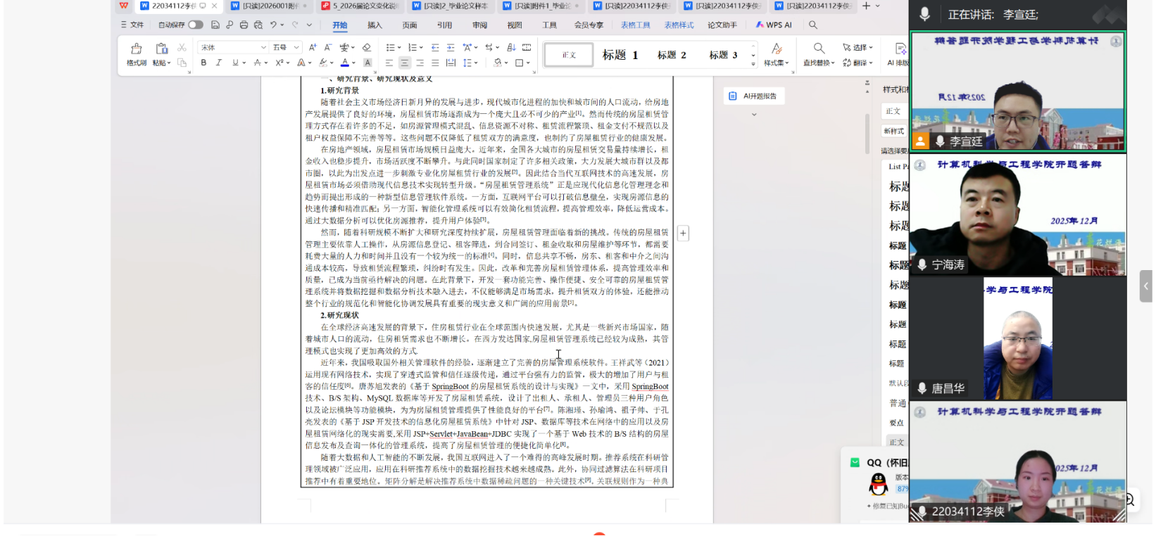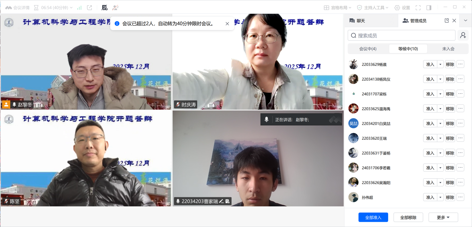 为严格把控毕业论文质量,筑牢人才培养关键环节,确保2026届毕业生毕业论文工作有序推进,2025年12月10日至24日,计算机科学与工程学院组织开展2026届学生毕业论文开题答辩工作。本次答辩覆盖软件工程、计算机科学与技术、数据科学与大数据技术、计算机科学与技术(二年制)四个专业,共804名学生参与,33名专职教师组成12个答辩组,通过腾讯会议有序完成线上开题答辩工作。