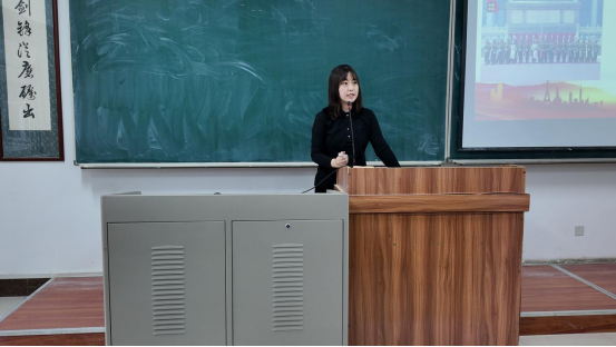 随后,马迪老师以“阅兵仪式里的家国情怀与信仰传承”为题,通过讲述不同时期的阅兵仪式,带领学子们从“视觉震撼”走进“精神共鸣”。她对比1949年开国大典阅兵时“万国牌”武器的艰难起步,到2019年国庆阅兵中“东风快递”“隐身战机”等国之重器的自信亮相,更特别聚焦阅兵队伍里的“抗战老兵方阵”——那些胸前挂满勋章、虽年迈却眼神坚定的老兵,正是连接历史与当下的“活教材”。“每一次阅兵,都是对革命先辈的致敬,也是对青年一代的召唤。”马迪老师引导学子思考:从抗战时期的“救亡图存”到新时代的“强国建设”,一代代共产党人的使命始终与国家命运紧密相连,而青年学子就是要接过这份“接力棒”,在各自领域为祖国发展贡献力量。